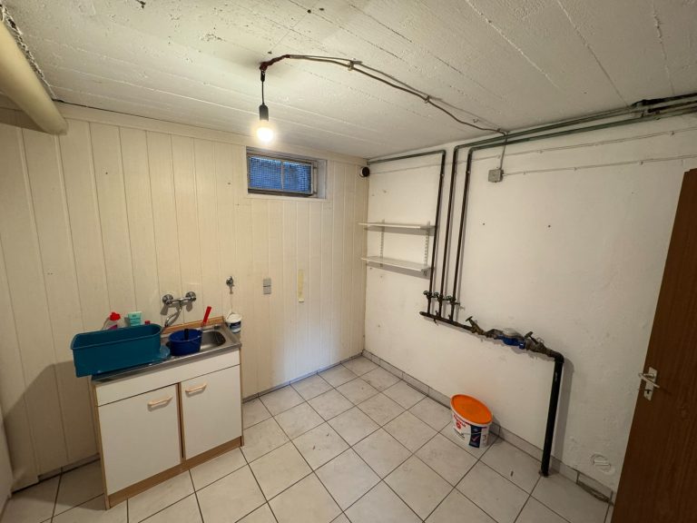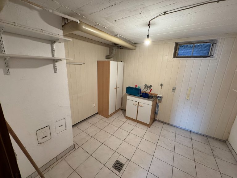 Im Untergeschoss befinden sich die Garage mit direktem Zugang ins Wohnhaus, zwei Zimmer, ein Wasch- und Trockenraum, ein Heizungsraum, ein Tankraum, zwei kleine Abstellräume sowie die Diele.