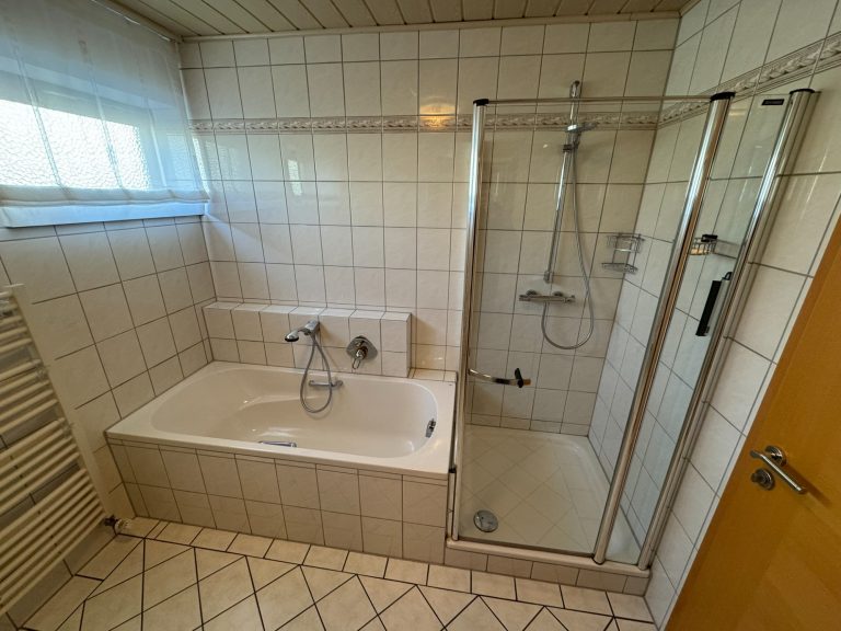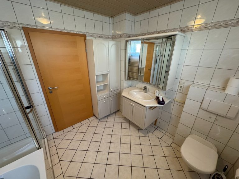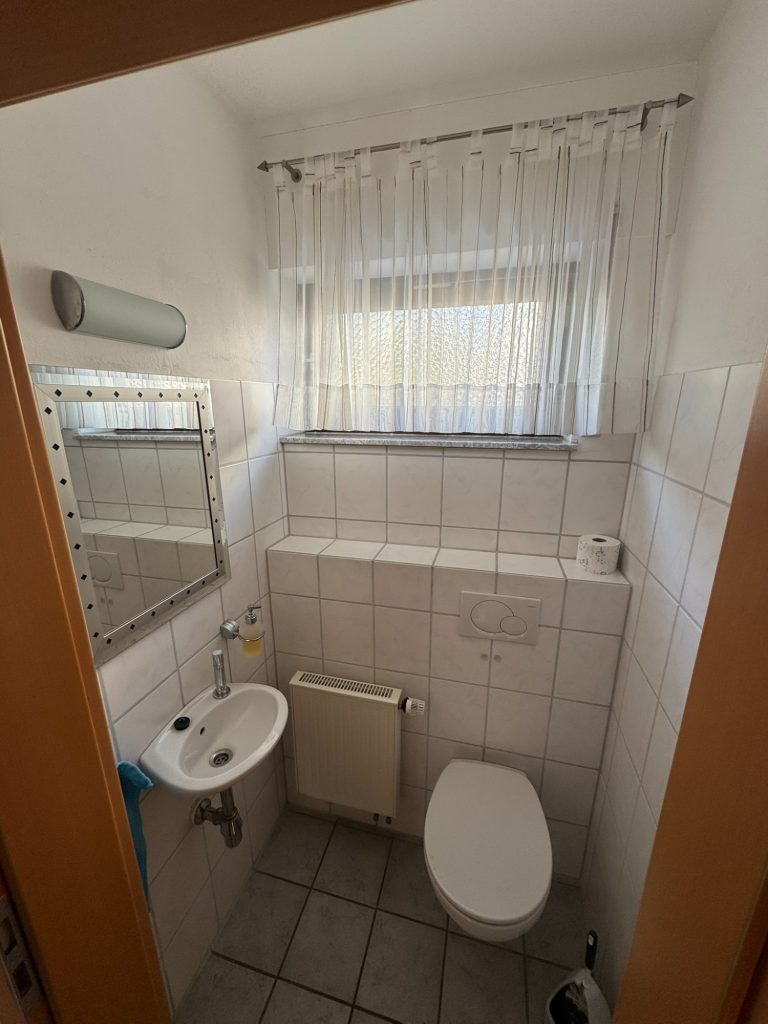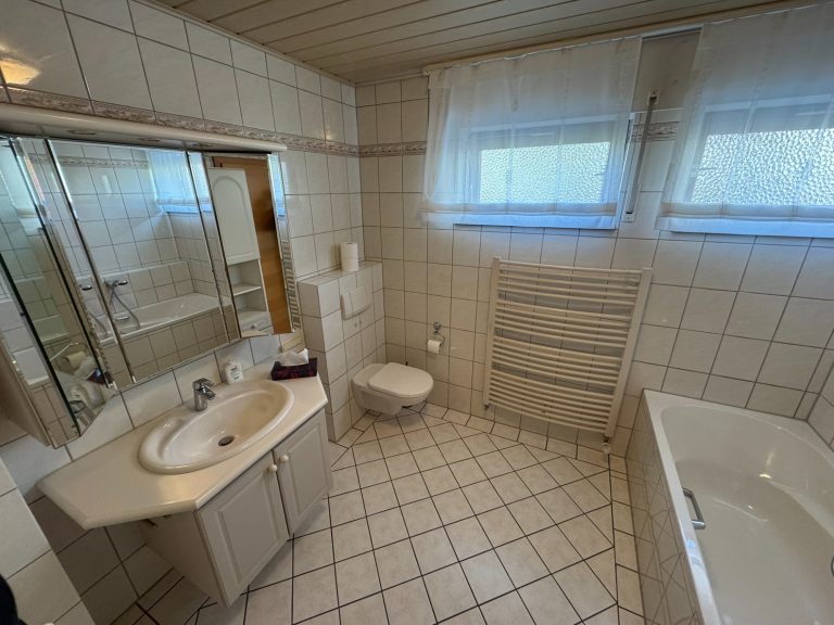 Im Parterre befinden sich drei Zimmer, die Küche, ein Badezimmer - ausgestattet mit Badewanne, Dusche, WC und Waschbecken, ein Gäste-WC sowie die Diele.