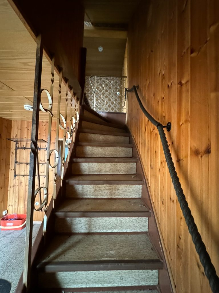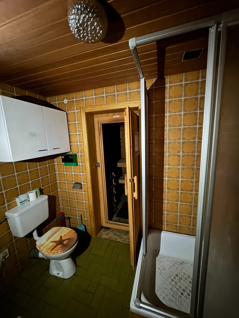 Im ersten Stock befinden sich 4 weitere Zimmer, ein weiteres Badezimmer (ausgestattet mit Dusche, Wachbecken und WC) sowie eine Sauna.